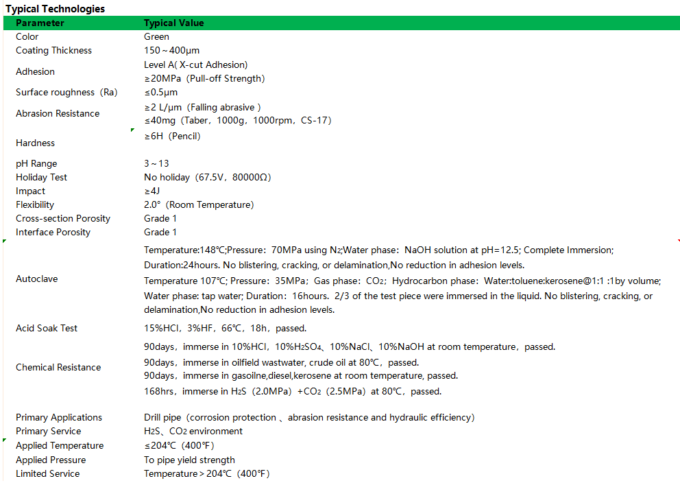 A powder applied hydrothion resistance internal coating for drill pipe, primary servicing high temperature and high pressre environment containing H2S and CO2.