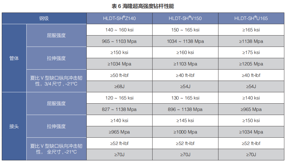 海隆超高強(qiáng)度鉆桿是一種適用于深井,超深井 , 大位移井等苛刻鉆井環(huán)境的專有產(chǎn)品,具有高強(qiáng)度、高韌性、高抗疲勞能力。通過采用特殊的材質(zhì)及嚴(yán)格的熱處理工藝控制,使其在強(qiáng)度提高的同時,還具備良好的沖擊韌性。